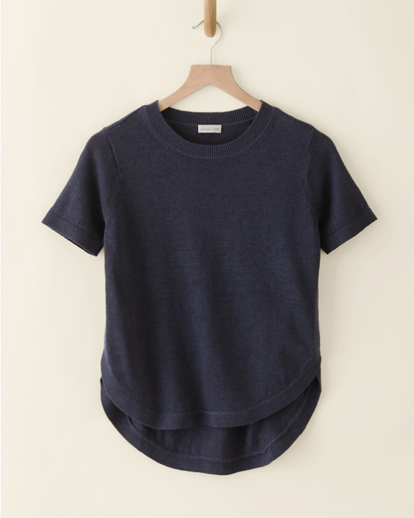 A sweater tee with attitude. Seasonless in a soft and well-textured linen knit, with an easy, comfy silhouette that goes to exciting places thanks to a curvaceous hem and dramatic overlapping side vents.