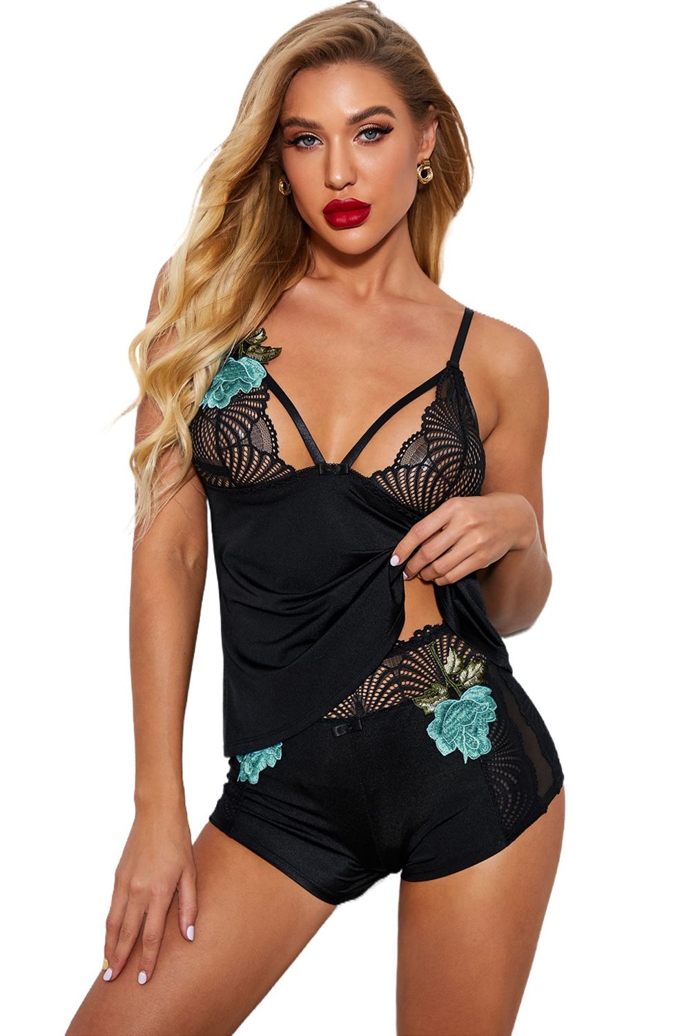 Black Floral Embroidery Scallops Lace Pajamas Set