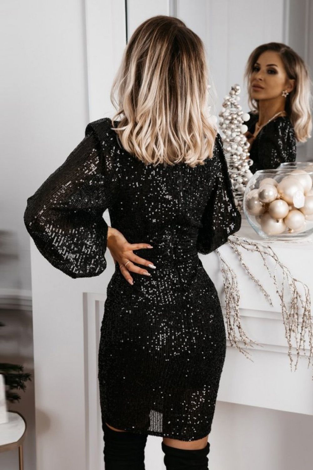 Black V Neck Balloon Sleeve Bodycon Glitter Sequin Dress