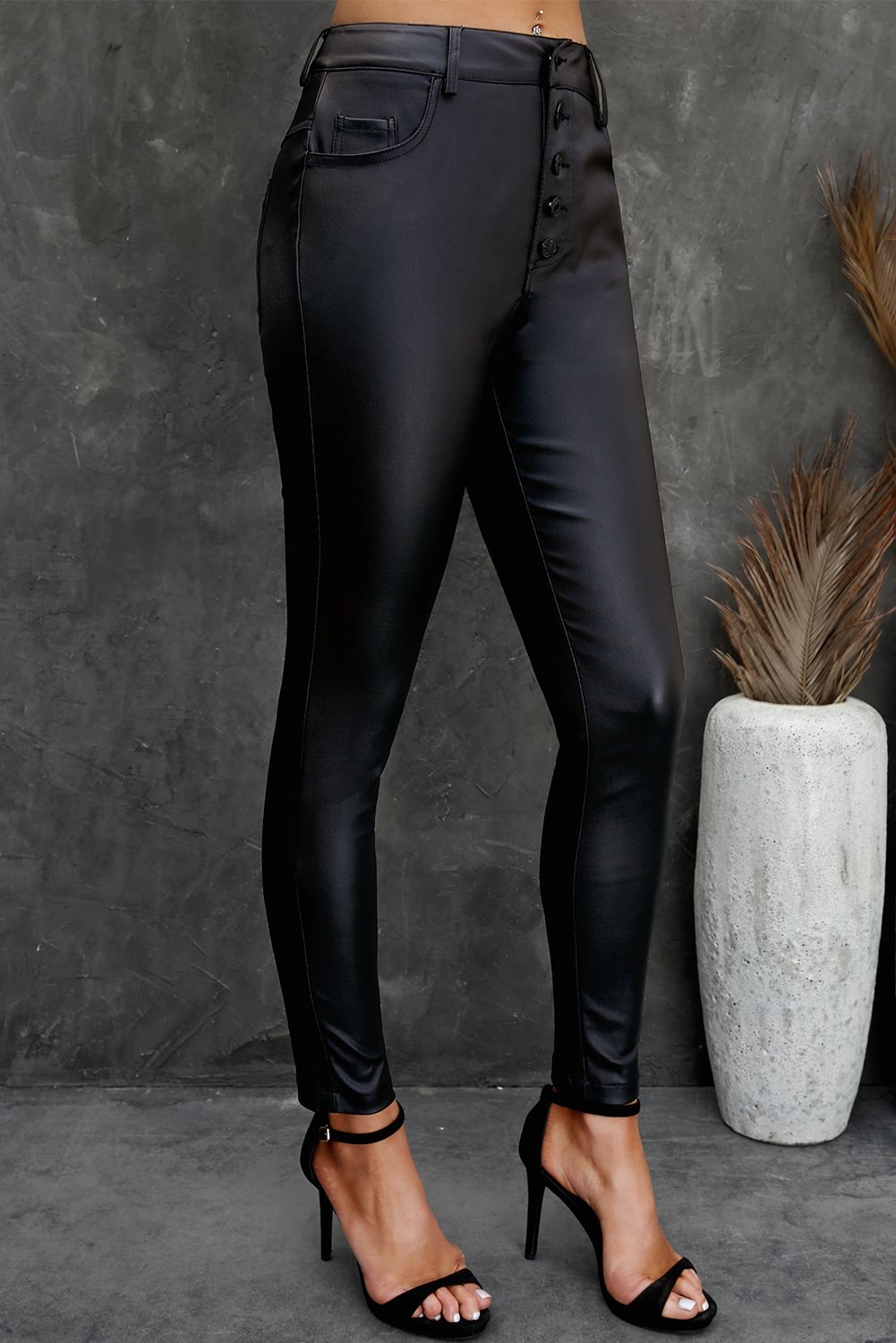 Faux Leather Button Fly High Waist Skinny Fit Pants