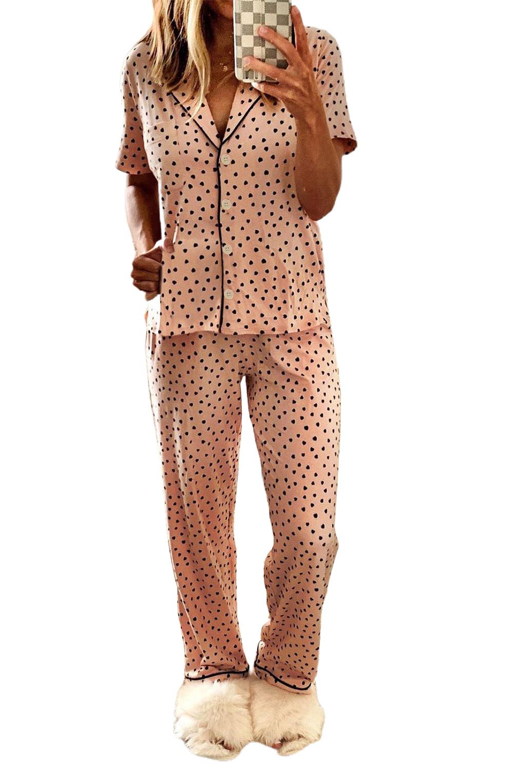 Pink Dotted Print Notched Collar Pajamas Set