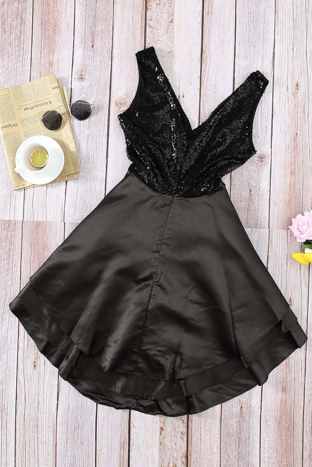 Luxe satin fabric, a V neck sequin top, multi-layer dip hem and a concealed back zip
