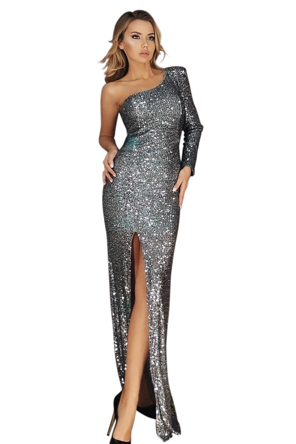 Silver Fortune One Shoulder Front Slit Sequin Gown
